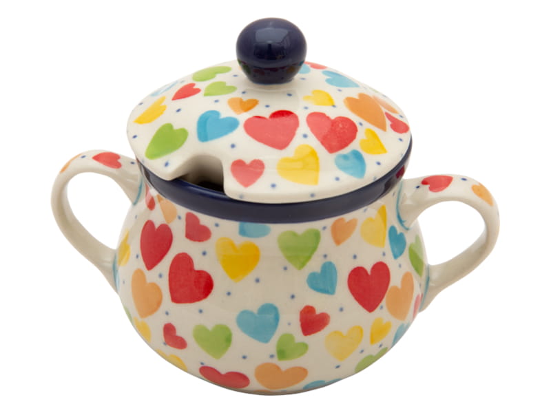 UNIQUE pattern - Heart pattern. Hearts of different sizes and colors on the background of the color of fired ceramics. Around navy blue dots.. The edge in navy blue. Boleslawiec pottery - handpainted.