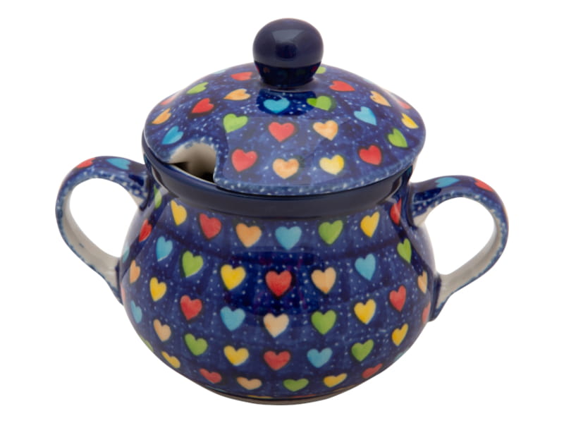 UNIQUE pattern - Heart pattern. Multicolored hearts on a navy blue background. The edge in navy blue. Boleslawiec pottery - handpainted.
