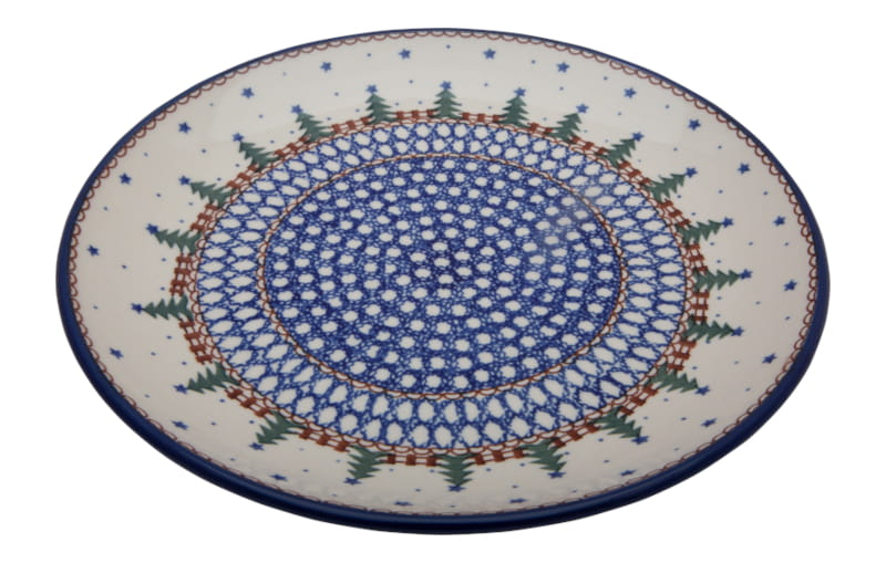 Wzór z choinkami i granatowy ornament. Wykończenie obrzeża w kolorze granatowym. Ceramika Bolesławiec - HANDMADE.