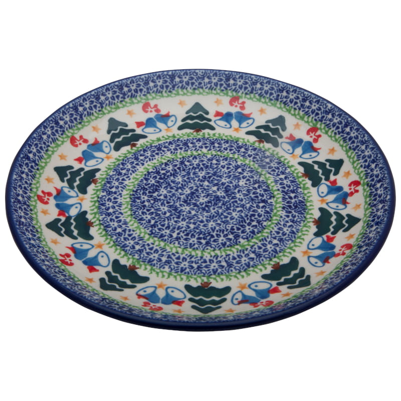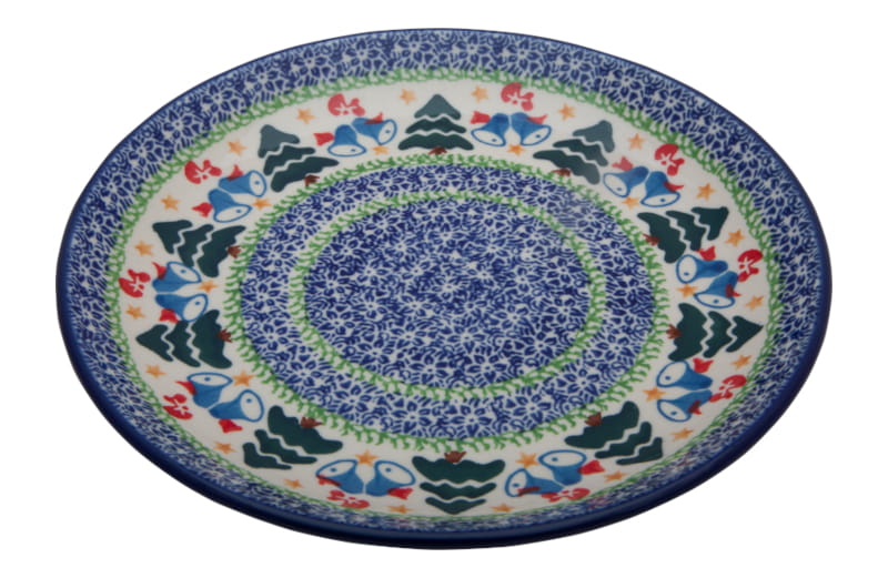 Wzór świąteczny w kolorach granatu, błękitu i zieleni. Dzwoneczki, gwiazdki i choinki wprowadzają zimowy nastrój. Wykończenie obrzeża w kolorze granatowym. Ceramika Bolesławiec - HANDMADE.