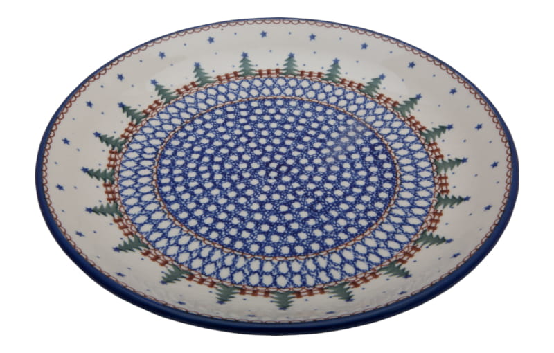 Wzór świąteczny w stylu vintage w kolorach błękitu z choinką, gwiazdkami i śniegiem. Geometryczny wzór kółka i brązowy płot. Wykończenie obrzeża w kolorze granatowym. Ceramika Bolesławiec - HANDMADE.