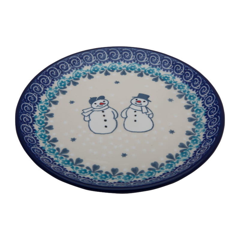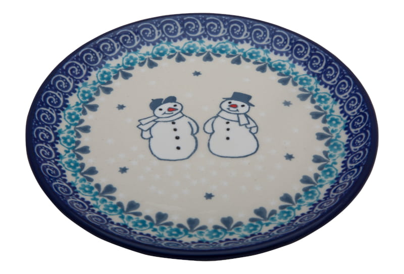 Wzór świąteczny z bałwankami w czapce i kapeluszu. Wokół jasnoniebieskie i białe gwiazdki. Wykończenie obrzeża w kolorze granatowym. Ceramika Bolesławiec - HANDMADE
