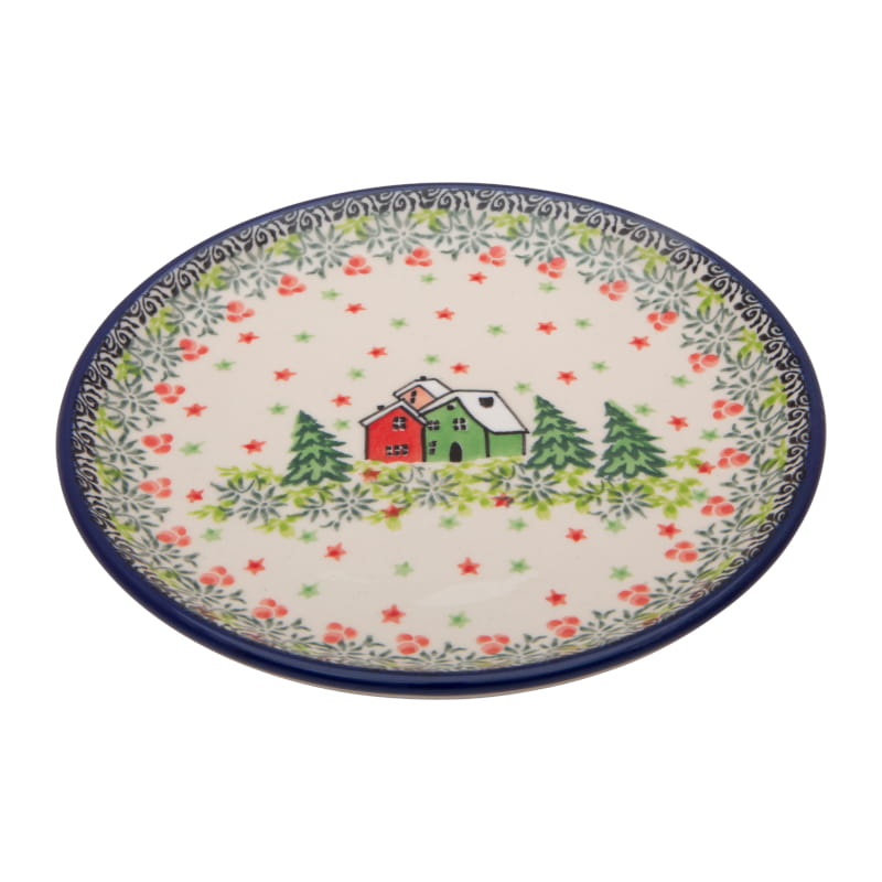 Prezent pod choinkę - BOŻE NARODZENIE. Wzór UNIKATOWY. Zimowy wzór w odcieniach zieleni i czerwieni. Domki, gwiazdki i świerki z roślinnym ornamentem. Wykończenie obrzeża w kolorze granatowym. Ceramika Bolesławiec - HANDMADE.