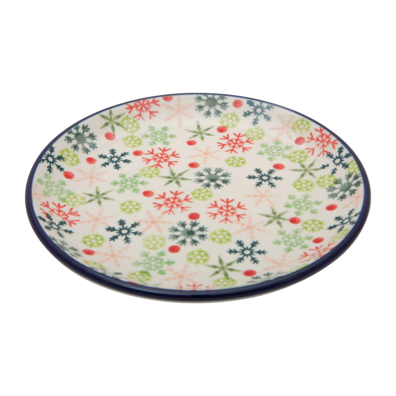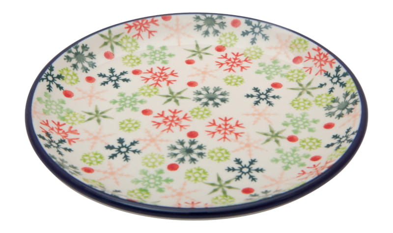 Wzór zimowy, unikat. Różnokształtne płatki śniegu, śnieżynki, w odcieniach zieleni i czerwieni. Wykończenie obrzeża w kolorze granatowym. Ceramika Bolesławiec – HANDMADE.