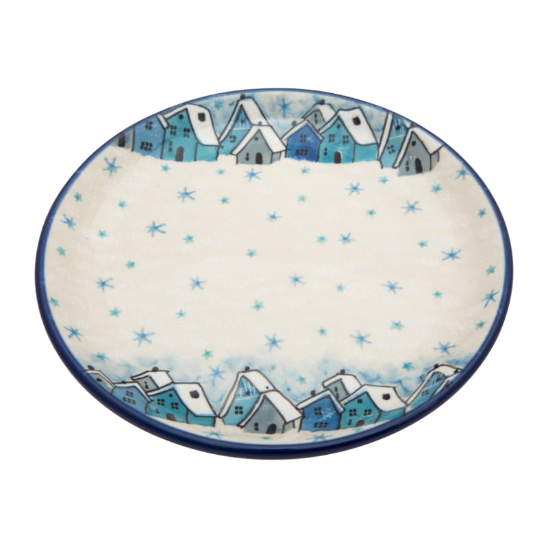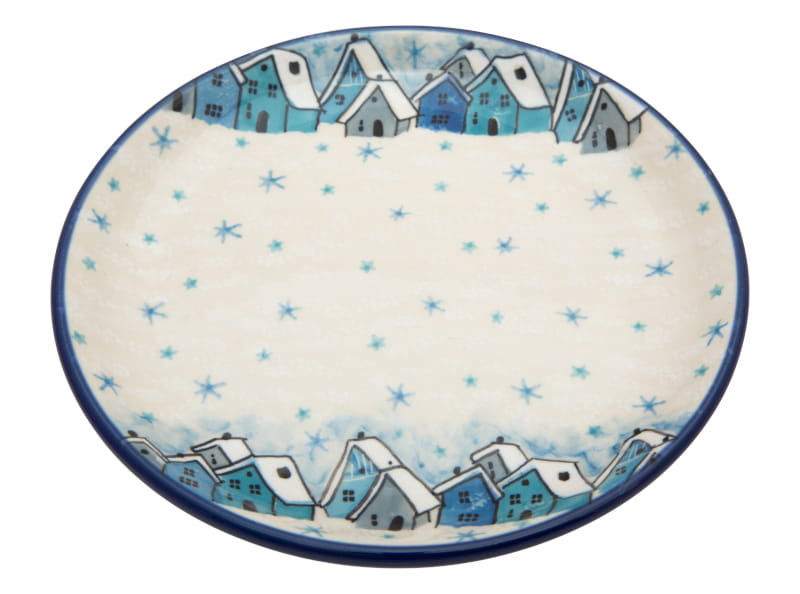 Wzór zimowy, unikat. Płatki śniegu w kolorze niebieskim i ośnieżone domki w odcieniach niebieskiego i szarym. Wykończenie obrzeża w kolorze granatowym. Ceramika Bolesławiec – HANDMADE.