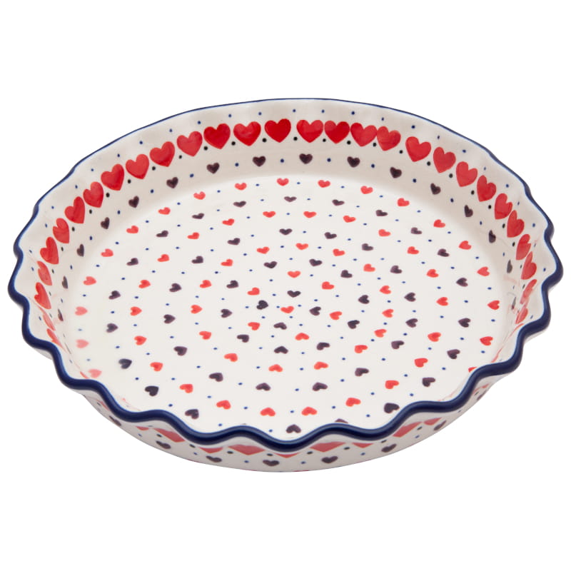 HEART pattern. Red and brown hearts and tiny blue dots. Border in navy blue. Boleslawiec pottery - handpainted.