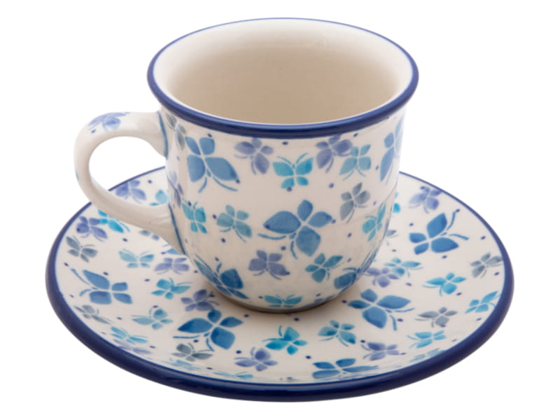 Pattern with delicate butterflies in shades of blue. Dots and edging in navy blue. Boleslawiec pottery - hand painted.