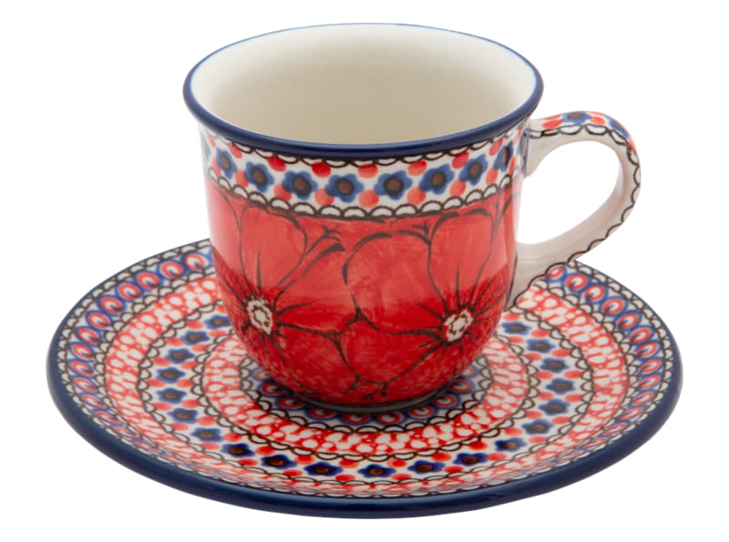 Unique pattern with with red flowers. Floral navy blue and red motif around. The edge in navy blue. Boleslawiec pottery - handpainted.