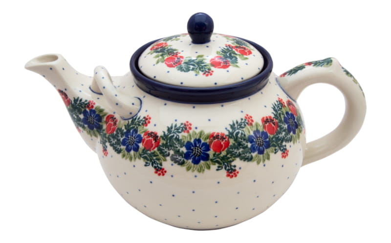 Floral pattern in red and navy blue. Boleslawiec pottery - handpainted.