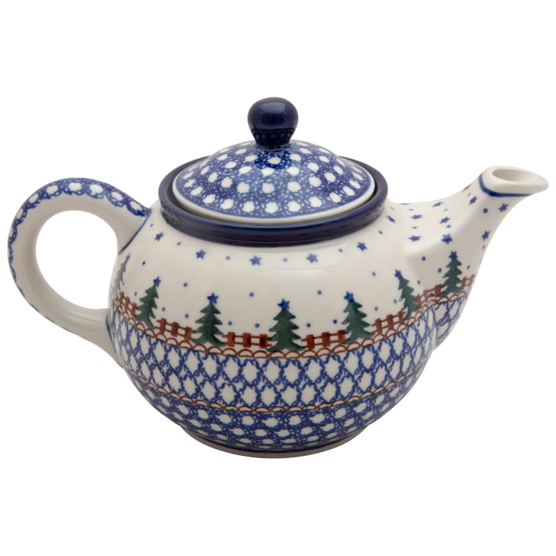 Christmas pattern in vintage style in blue and brown colors with a Christmas tree, stars and snow. Geometric circle pattern and brown fence. The edge in navy blue. Boleslawiec pottery - handpainted.