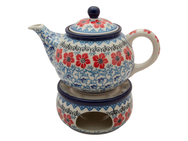 Floral pattern in red and blue. Poppies with a delicate floral ornament around. The edge in navy blue. Boleslawiec pottery - handpainted.