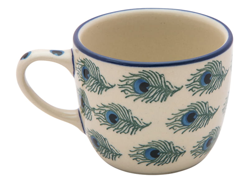 Original Bunzlauer Keramik. Einzigartig Muster in grün und kobaltblau mit Motiv Pfauenfedern. Kobaltblauer (dunkelblauer) Rand.
