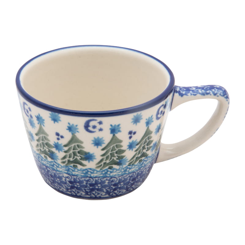Wintermuster. Grüne Weihnachtsbäume, Sterne und der Mond in Blautönen. Pflanzen Sie blaue Ornamente. Kobaltblauer (dunkelblauer) Rand. Original Bunzlauer Keramik.