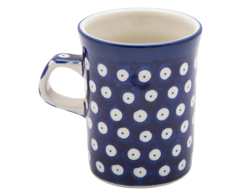 Original Bunzlauer Keramik. CLASSIC Muster. Weiße Punkte auf dunkel-blauem Hintergrund. Weißer Rand (Die natürliche Farbe des Brennprozesses).