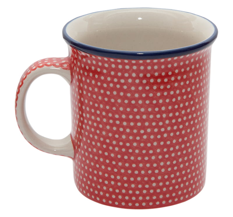 Original Bunzlauer Keramik. UNIQUE-Muster Classic-Stil. Weiße Punkte auf roten Hintergrund. Kobaltblauer (dunkelblauer) Rand.