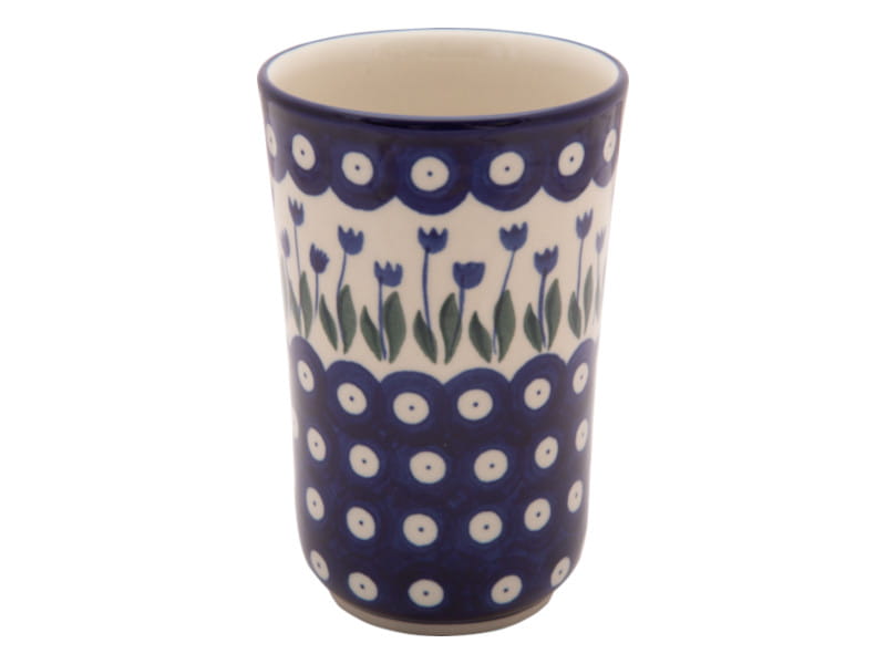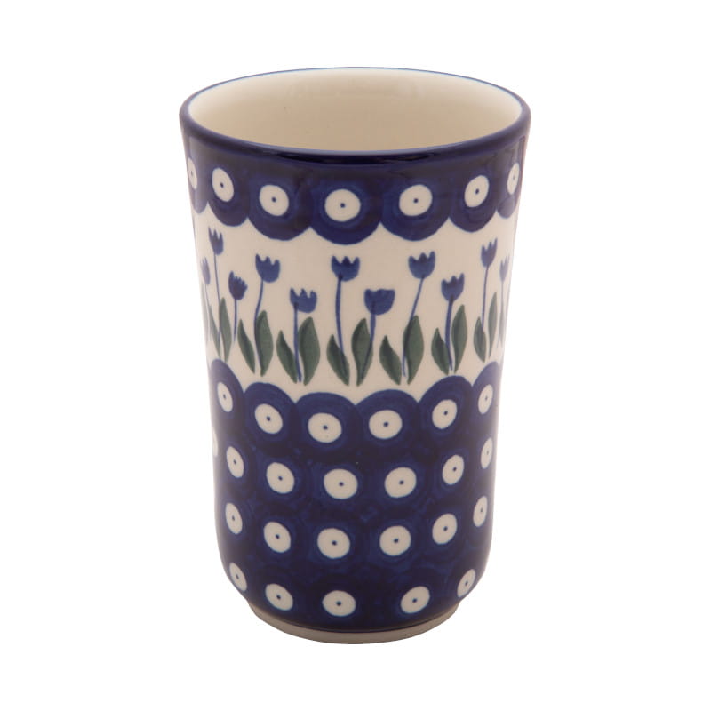 Original Bunzlauer Keramik. Klassisches Muster mit Pflanzenmotiven in Grün und Marineblau mit Punkten in Kreisen. Kobaltblauer (dunkelblauer) Rand.