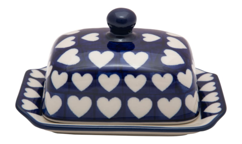 Original Bunzlauer Keramik. CLASSIC Muster - VINTAGE Stil. Weiße Herzen auf einem dunkelblauen Hintergrund. Kobaltblauer (dunkelblauer) Rand.