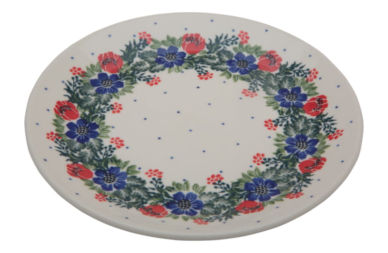 Original Bunzlauer Keramik. BLUMENmuster in rot und marineblau. Weißer Rand (Die natürliche Farbe des Brennprozesses).