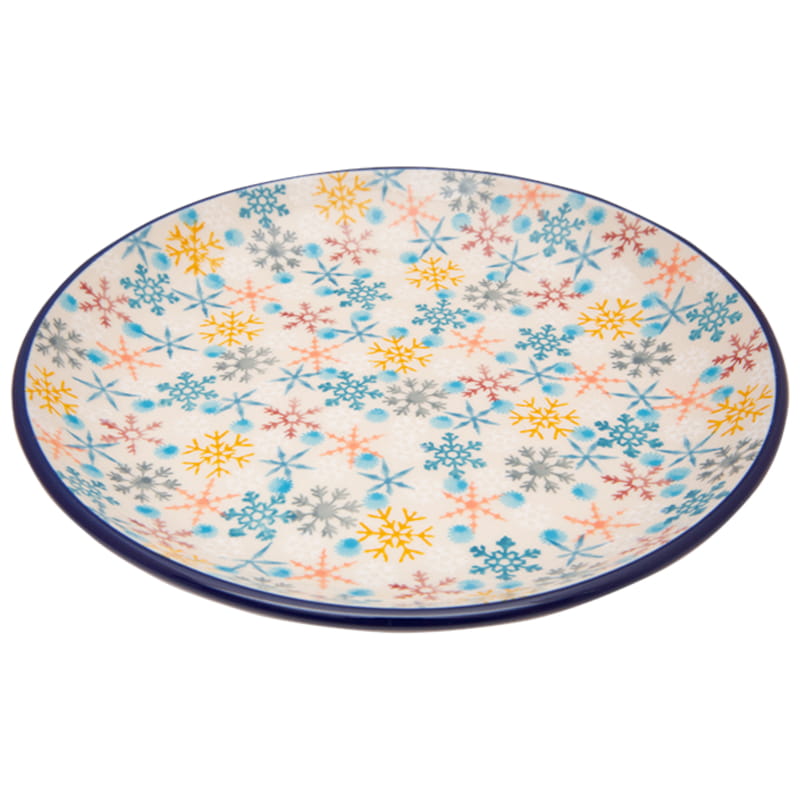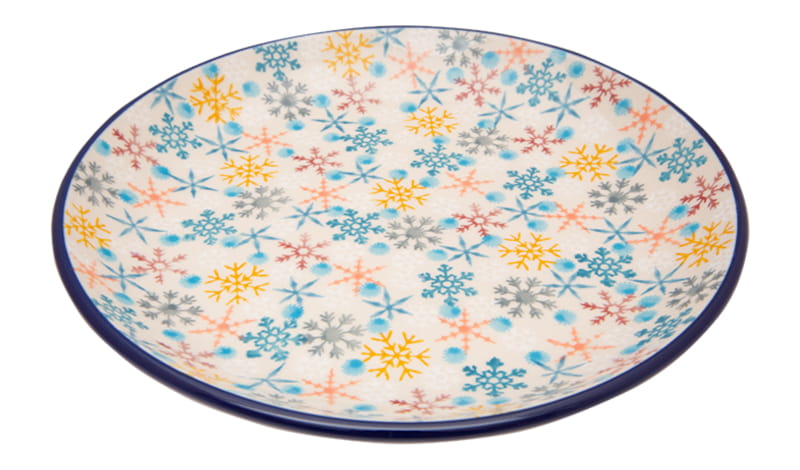 EINZIGARTIGES Muster - Winter. Mehrfarbige Schneeflocken. Kobaltblauer (dunkelblauer) Rand. Original Bunzlauer Keramik.