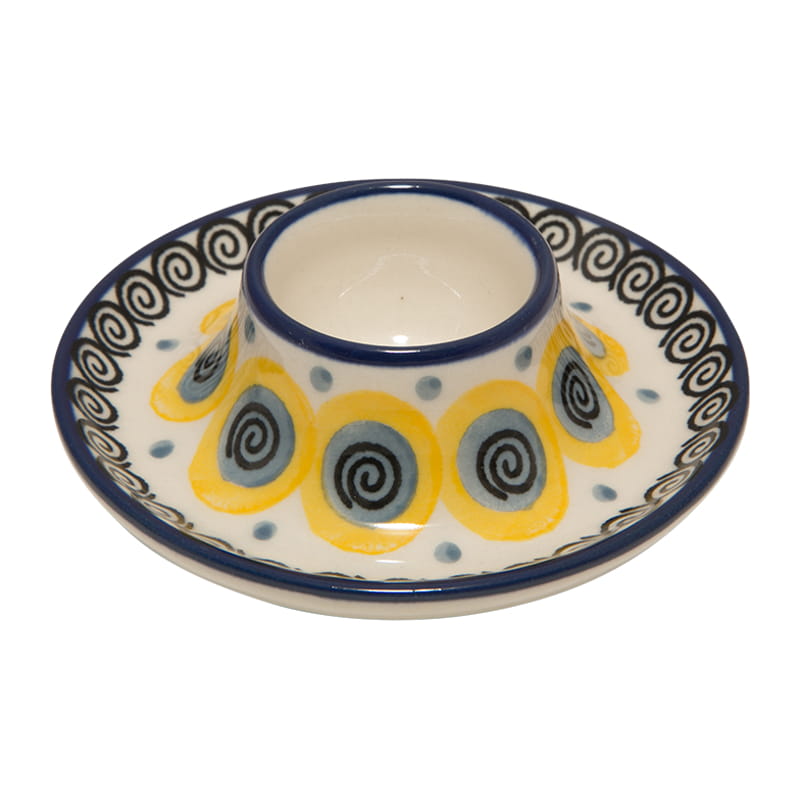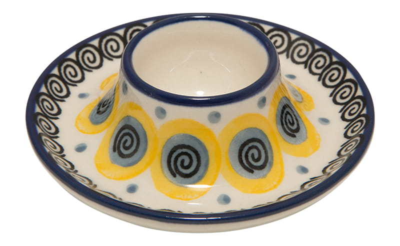 Original Bunzlauer Keramik. Geometrische Muster VINTAGE-Stil. Schwarze Spiralen mit gelben Elementen. Kobaltblauer (dunkelblauer) Rand.