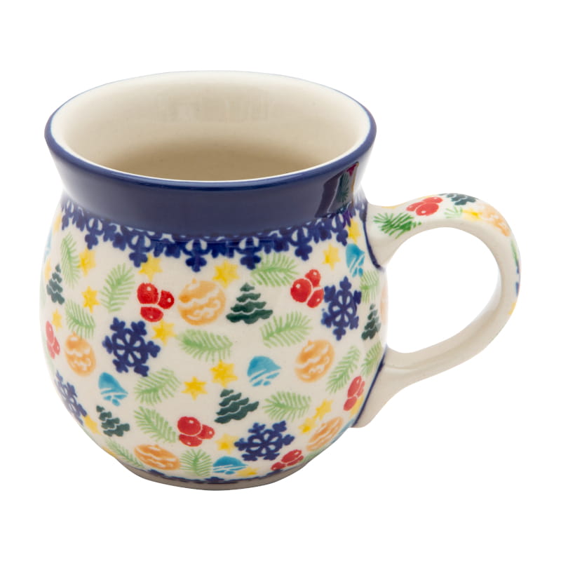 EINZIGARTIGES Muster Weihnachten. Bunte Glocken, Weihnachtsbäume, Eibenfrucht, Fichtenzweige, Sterne, Christbaumkugeln. Abgeschlossen mit einem kobaltblauen Rand. Original Bunzlauer Keramik.