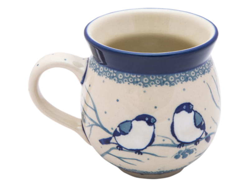 Original Bunzlauer Keramik. Einzigartiges Muster. Zwei Vögel in Winterfarben. Kobaltblauer (dunkelblauer) Rand.