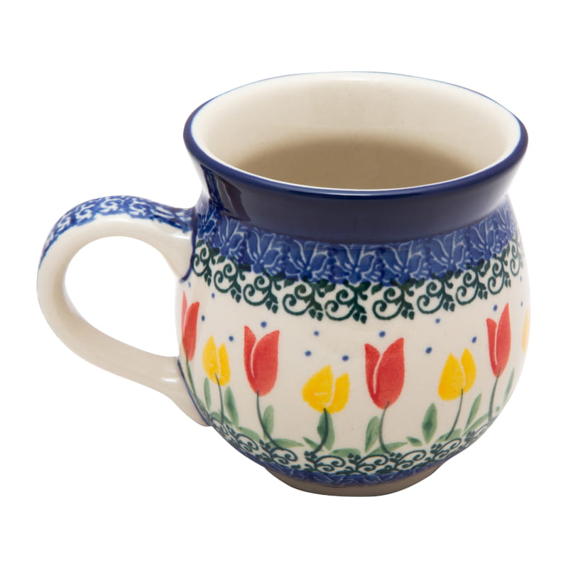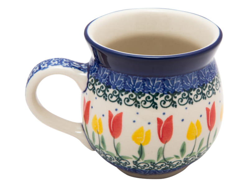 Muster mit Tulpen . Gelb zwischen Rot. Zartes, ornamentales, grünes Pflanzenmotiv rundherum. Kobaltblauer (dunkelblauer) Rand. Original Bunzlauer Keramik.