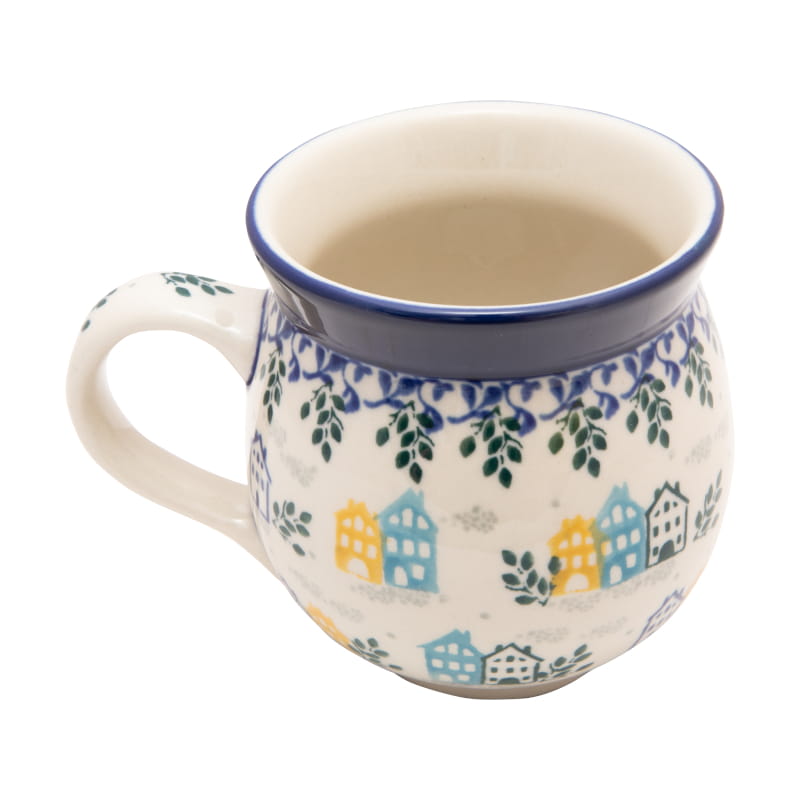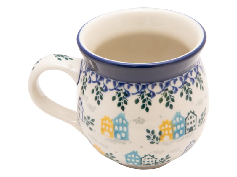 Muster mit Häusern in gelben, blauen und grünen zwischen grauen Wolken Und grünen Blättern. Blaugrünes Pflanzenornament darüber. Kobaltblauer (dunkelblauer) Rand. Original Bunzlauer Keramik.