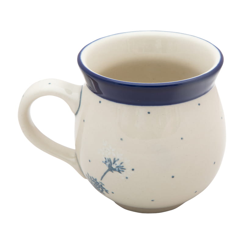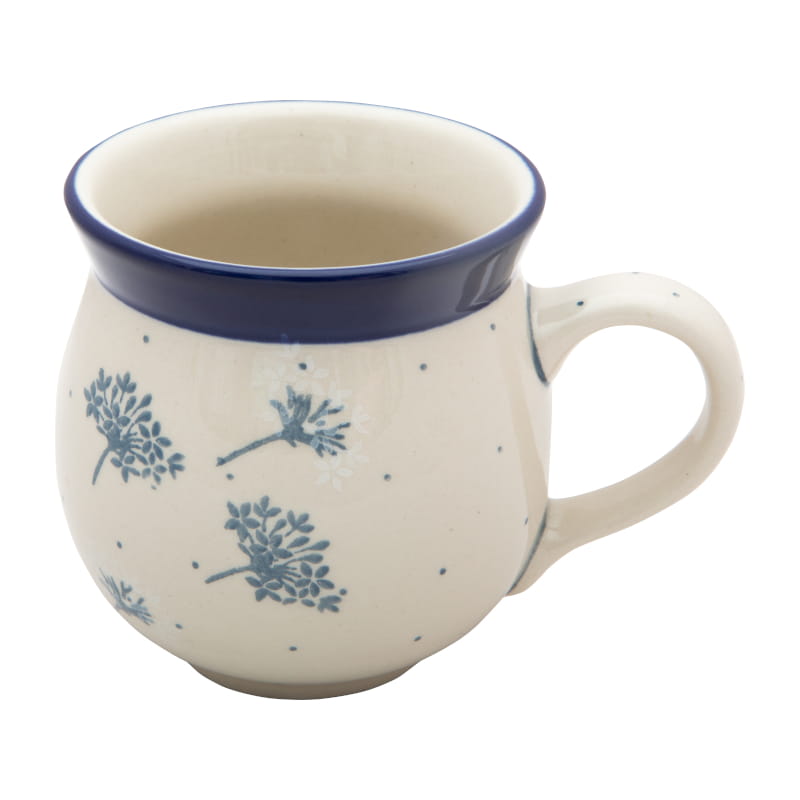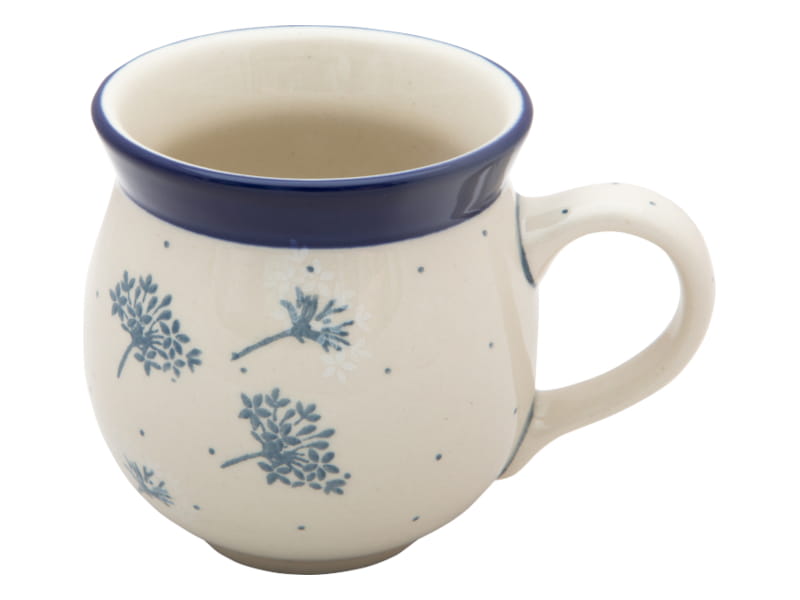 Zartes Blumenmuster in blaugrauen und weißen Farben (blühender und verblasster Dill). Winzige hellblaue Punkte. Kobaltblauer (dunkelblauer) Rand. Original Bunzlauer Keramik.
