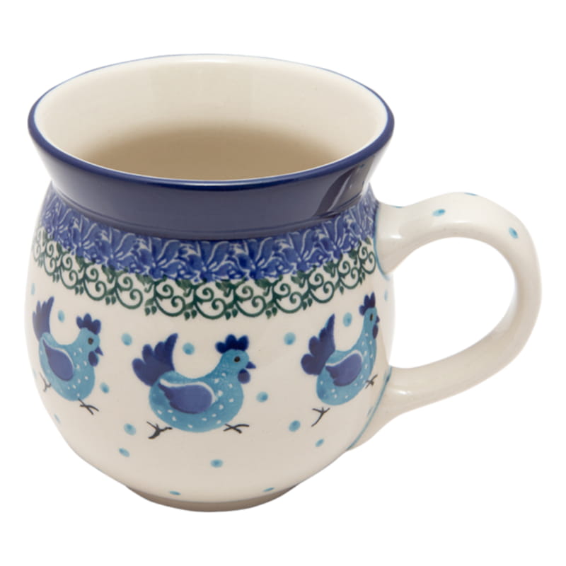 Muster mit Hühnern. Laufende Henne in Blau und Marineblau. Kobaltblauer (dunkelblauer) Rand. Original Bunzlauer Keramik.