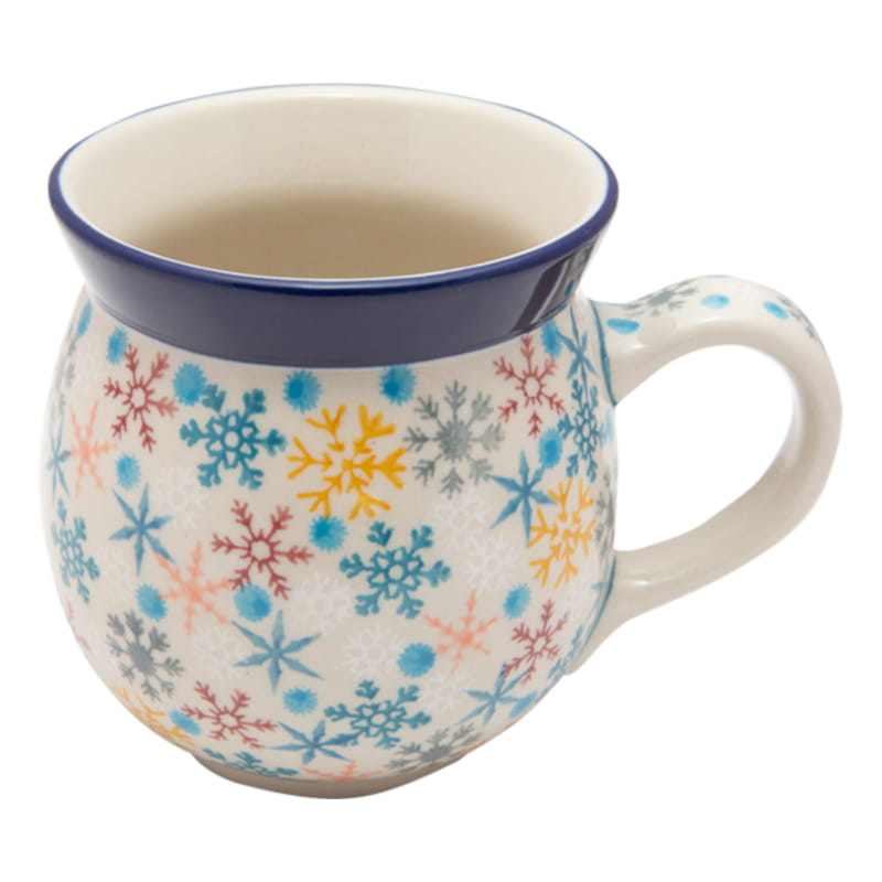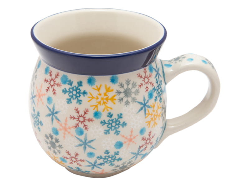 EINZIGARTIGES Muster - Winter. Mehrfarbige Schneeflocken. Kobaltblauer (dunkelblauer) Rand. Original Bunzlauer Keramik.