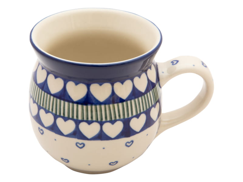 Klassische Muster - VINTAGE-Stil. Weiße Herzen auf marineblauem Hintergrund, getrennt durch grüne Linien und kleine marineblaue Herzen auf weißem Hintergrund. Kobaltblauer (dunkelblauer) Rand. Original Bunzlauer Keramik.