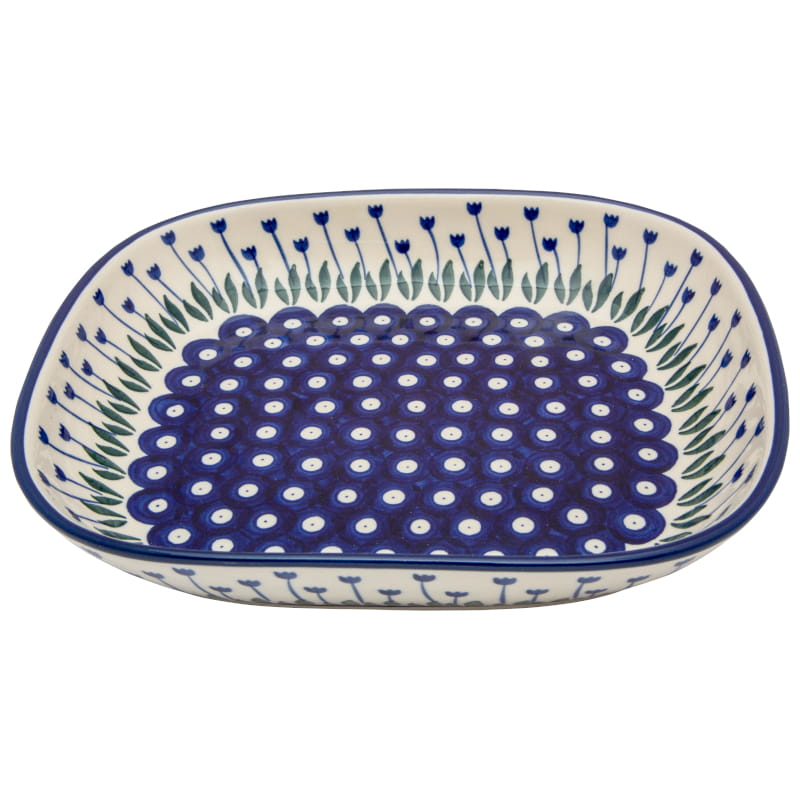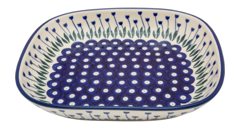 Original Bunzlauer Keramik. Klassisches Muster mit Pflanzenmotiven in Grün und Marineblau mit Punkten in Kreisen. Kobaltblauer (dunkelblauer) Rand.