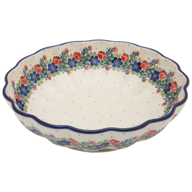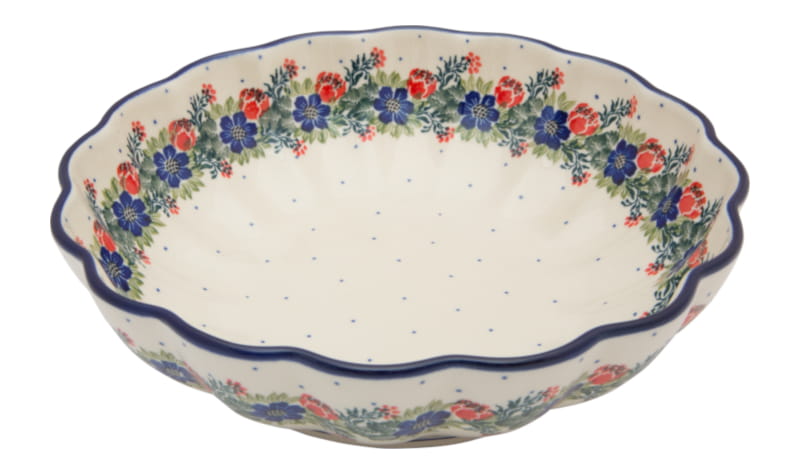 Original Bunzlauer Keramik. BLUMENmuster in rot und marineblau. Weißer Rand (Die natürliche Farbe des Brennprozesses).