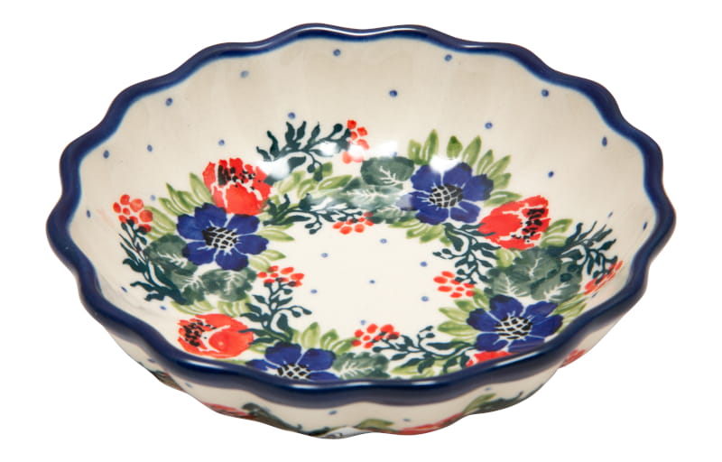 Original Bunzlauer Keramik. BLUMENmuster in rot und marineblau. Weißer Rand (Die natürliche Farbe des Brennprozesses).