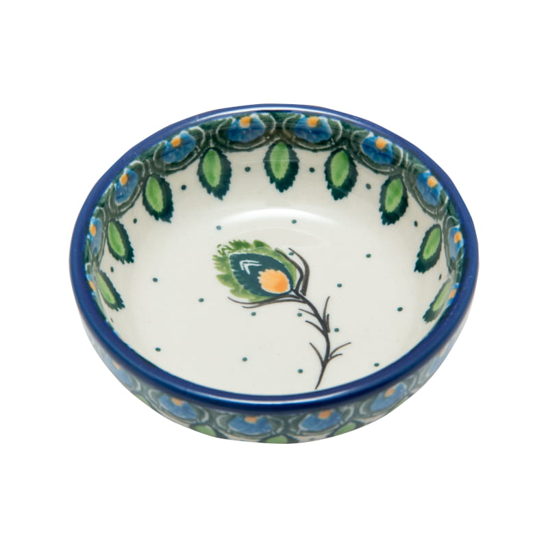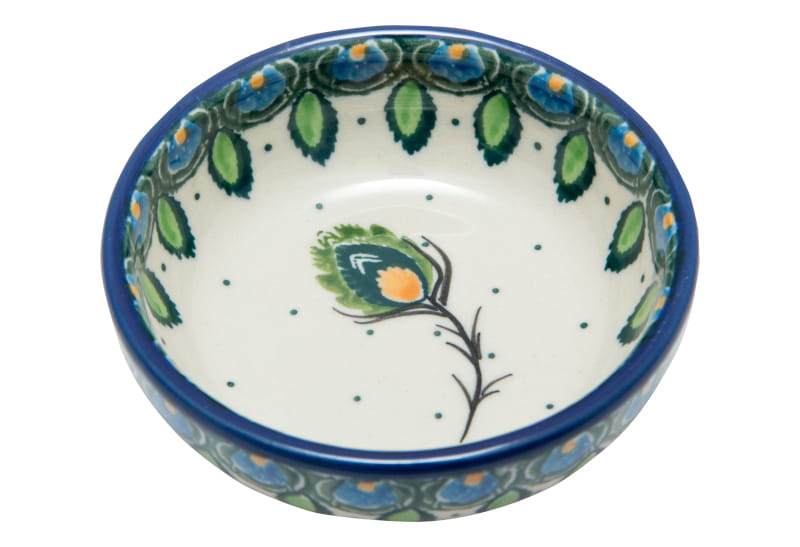 Einzigartig Muster in grün und kobaltblau mit Motiv Pfauenfedern. Kobaltblauer (dunkelblauer) Rand. Original Bunzlauer Keramik.