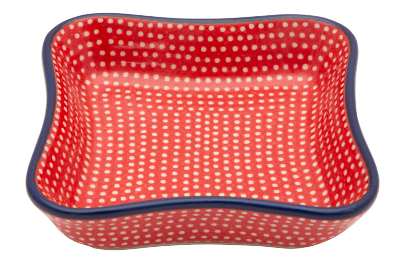 Original Bunzlauer Keramik. UNIQUE-Muster Classic-Stil. Weiße Punkte auf roten Hintergrund. Kobaltblauer (dunkelblauer) Rand.