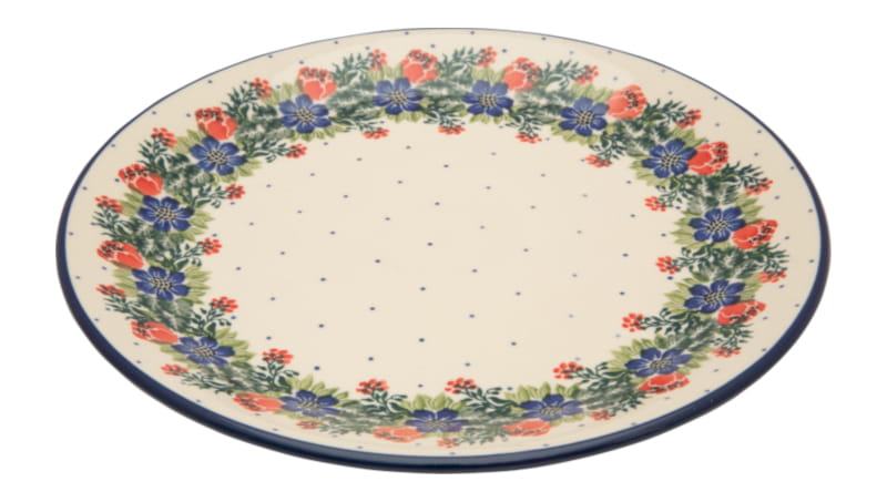 Original Bunzlauer Keramik. BLUMENmuster in rot und marineblau. Weißer Rand (Die natürliche Farbe des Brennprozesses).