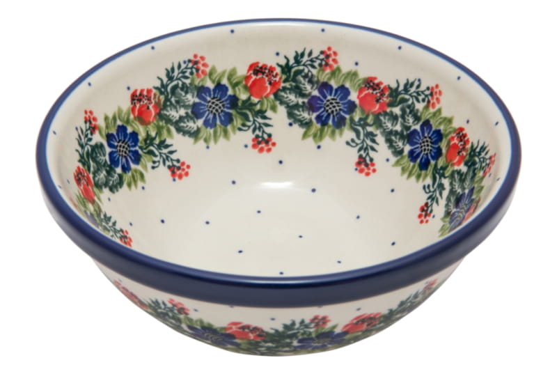 Original Bunzlauer Keramik. Classic Muster mit floralen Motiven in grün und dunkelblau. Kobaltblauer (dunkelblauer) Rand.