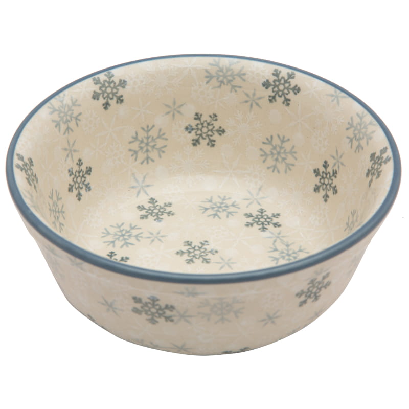 EINZIGARTIGES Muster. Schneeflocken in verschiedenen Größen in Weiß und Grau. Grauer Rand. Original Bunzlauer Keramik.