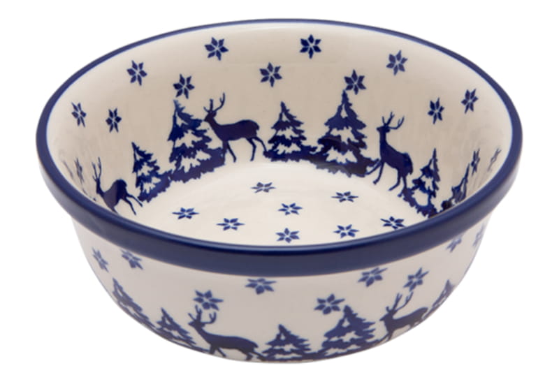 Wintermuster in Marineblau. Muster mit Schneeflocken, Rentieren und Weihnachtsbäumen. Kobaltblauer (dunkelblauer) Rand. Original Bunzlauer Keramik.