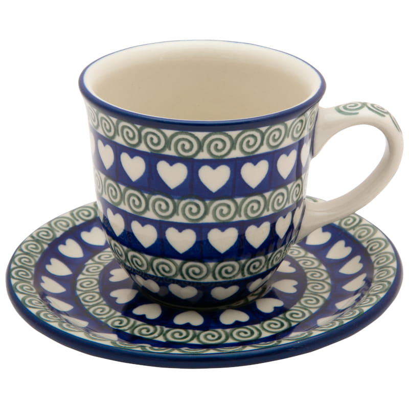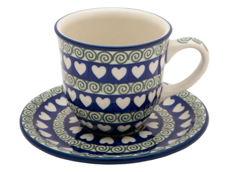 HERZMuster - weiße Herzen auf einem dunkelblauen Hintergrund und grünen Spiralen. Kobaltblauer (dunkelblauer) Rand. Original Bunzlauer Keramik.