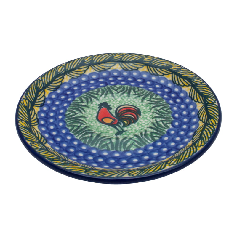 Original Bunzlauer Keramik. EINZIGARTIGES Tiermuster. Roter und gelber Hahn zwischen Blumenmuster mit einer blauen Glocke. Ornament in den Farben Schwarz, Grün und Blau. Ornament in den Farben Schwarz, Grün und Blau. Kobaltblau (Marineblau) Rand.