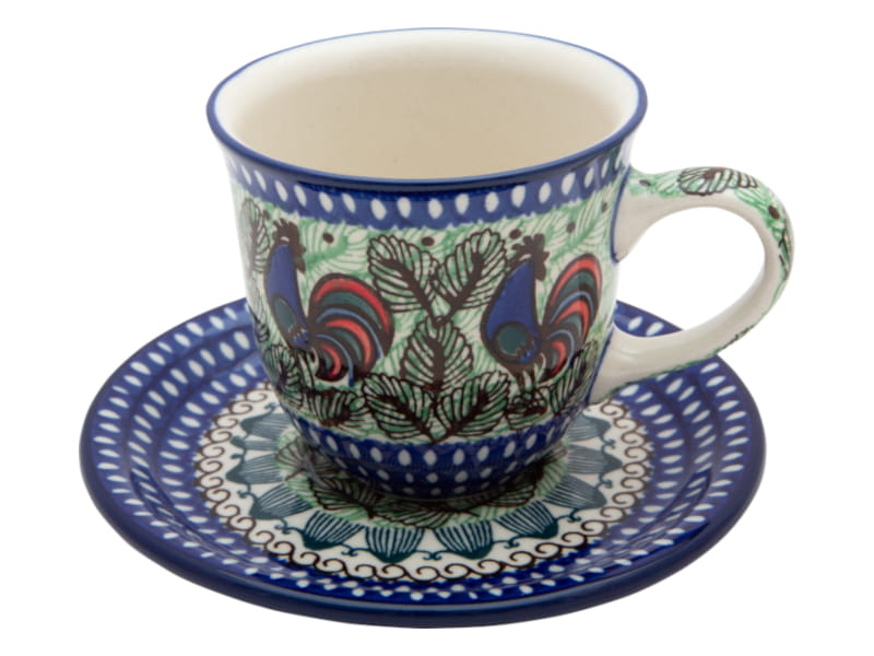 EINZIGARTIGES Muster mit Hahn. Roter, grüner und blauer Hahn zwischen Kohlblättern. Ornament in den Farben Schwarz, Grün und Blau auf der Untertasse. Kobaltblau (Marineblau) Rand. Original Bunzlauer Keramik.