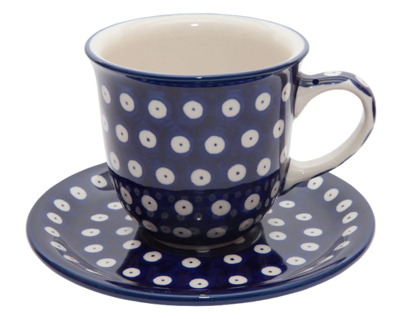 Punktdekoration Bunzlau. CLASSIC Muster. Weiße Punkte auf dunkel-blauem Hintergrund. Kobaltblauer (dunkelblauer) Rand. Original Bunzlauer Keramik.