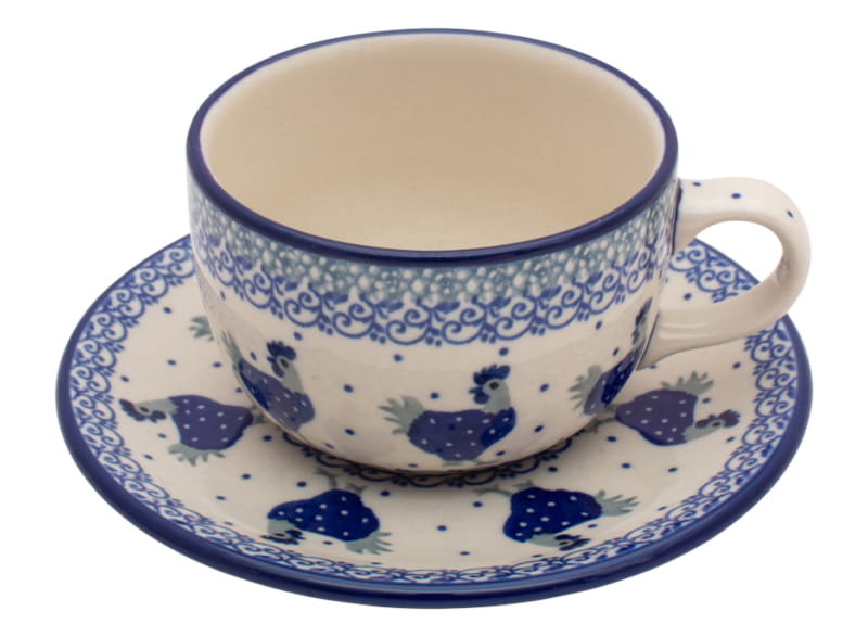 Muster mit Hühnern. Henne in Marineblau und Grau. Kobaltblauer (dunkelblauer) Rand. Original Bunzlauer Keramik.