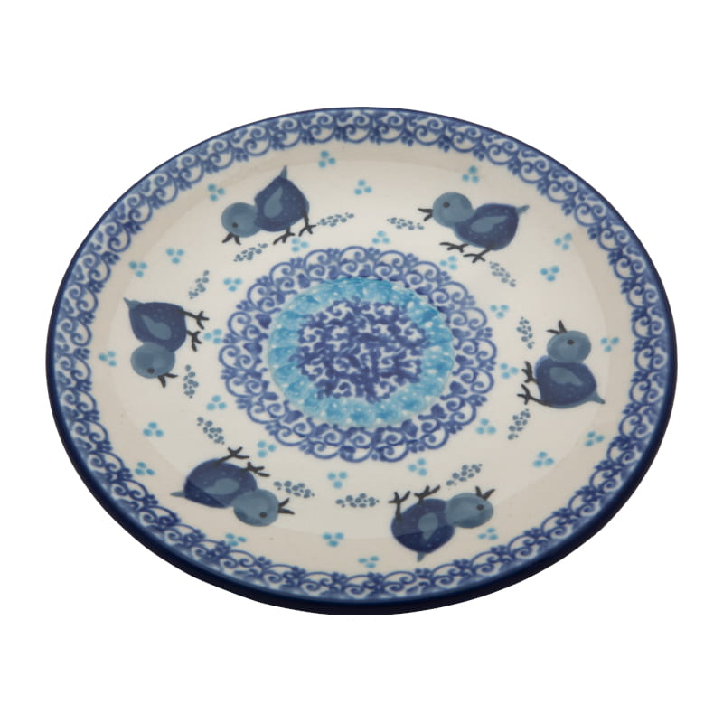 Muster mit Hühnern. Huhn in Marineblau und Grau. Kobaltblauer (dunkelblauer) Rand. Original Bunzlauer Keramik.
