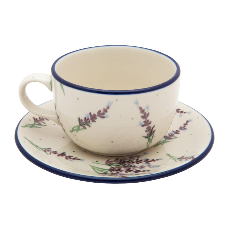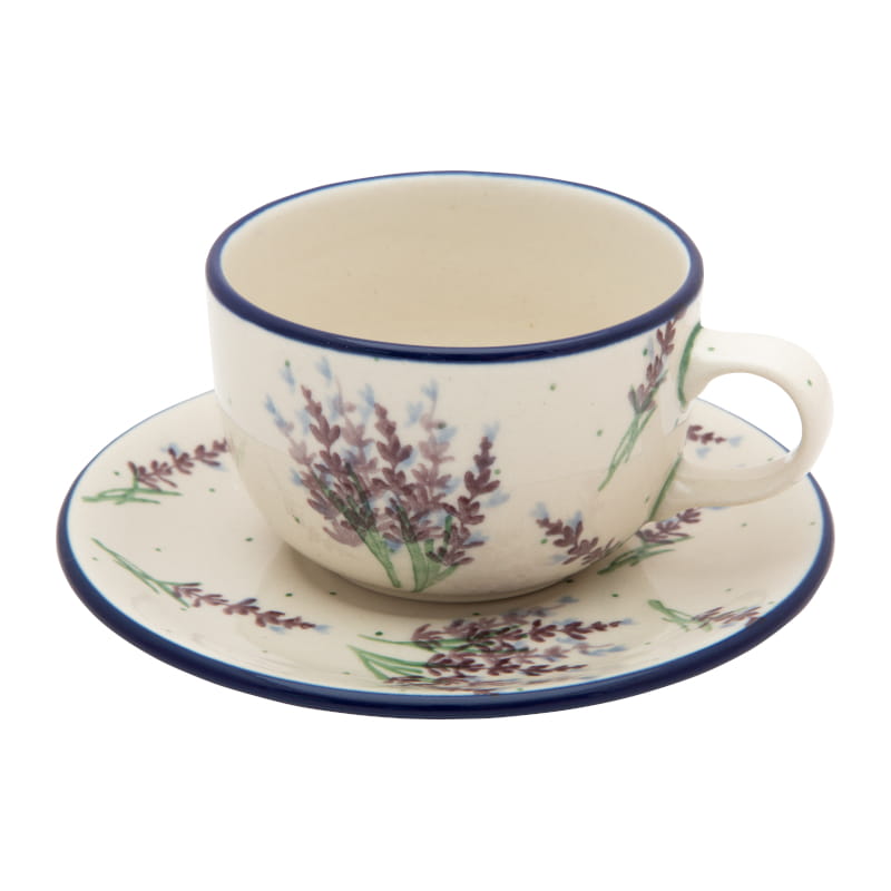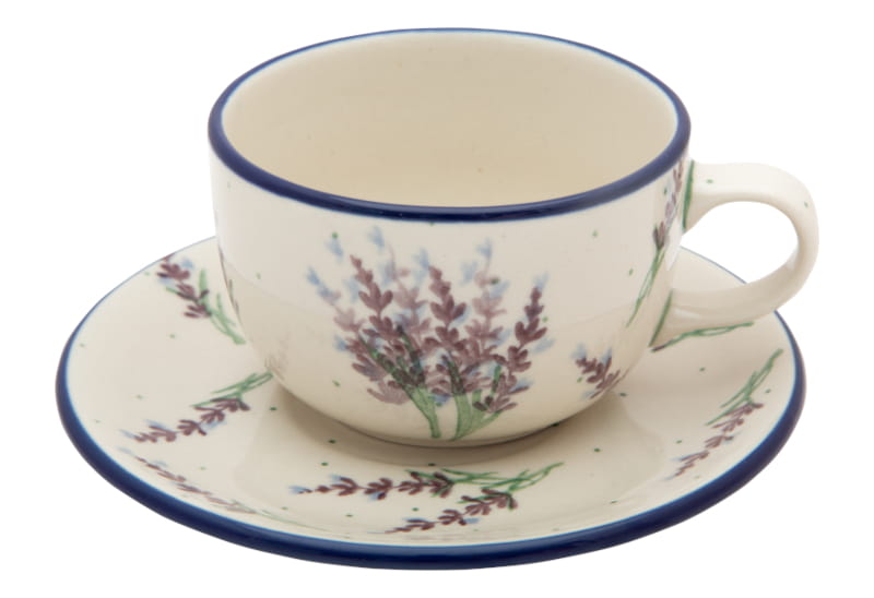 Ein zartes, von Lavendel inspiriertes Pflanzenmotiv in Violett- und Grüntönen. Kobaltblauer (dunkelblauer) Rand. Original Bunzlauer Keramik.