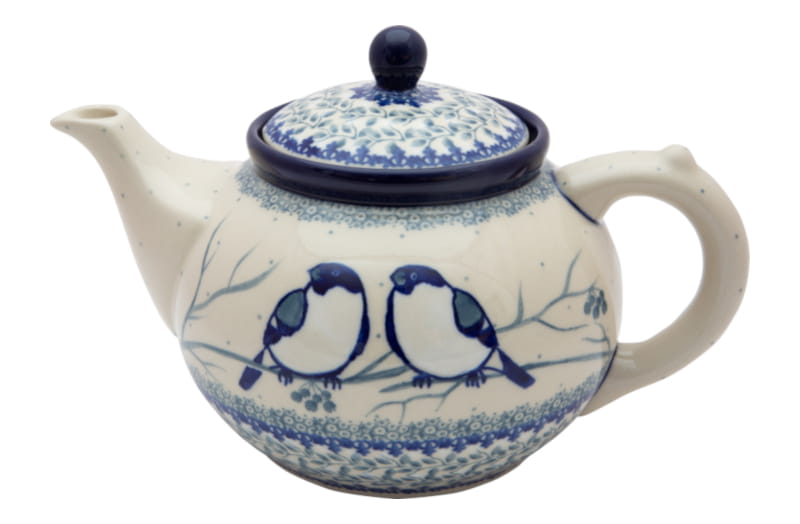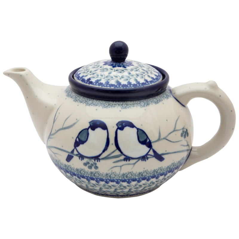 Teekanne mit Sieb zum Brauen von Kräutern und Tee. Original Bunzlauer Keramik. Einzigartiges Muster - Gimpelvogel. Zwei Vögel in Winterfarben. Kobaltblauer (dunkelblauer) Rand.