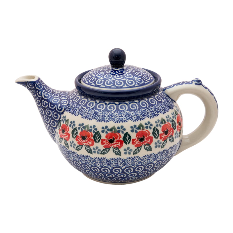 Teekanne mit Sieb zum Brauen von Kräutern und Tee. Original Bunzlauer Keramik. Blumenmuster in rot. Kobaltblauer (dunkelblauer) Rand.